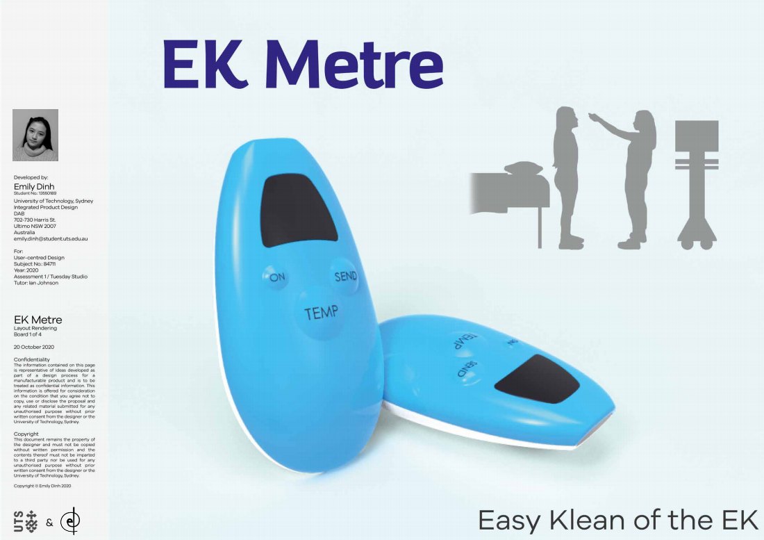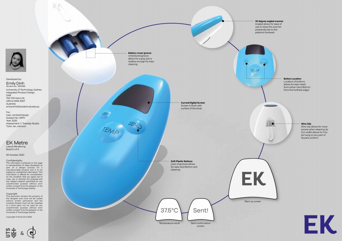To learn and stress the importance of user centered design, I was tasked to redesign the hospital thermometer, in response to the COVID-19 pandemic. The EK Metre is designed to contactlessly measure, record and send the patient's temperature to the hospital system, and give time for the nurse to spend giving proper patient care.