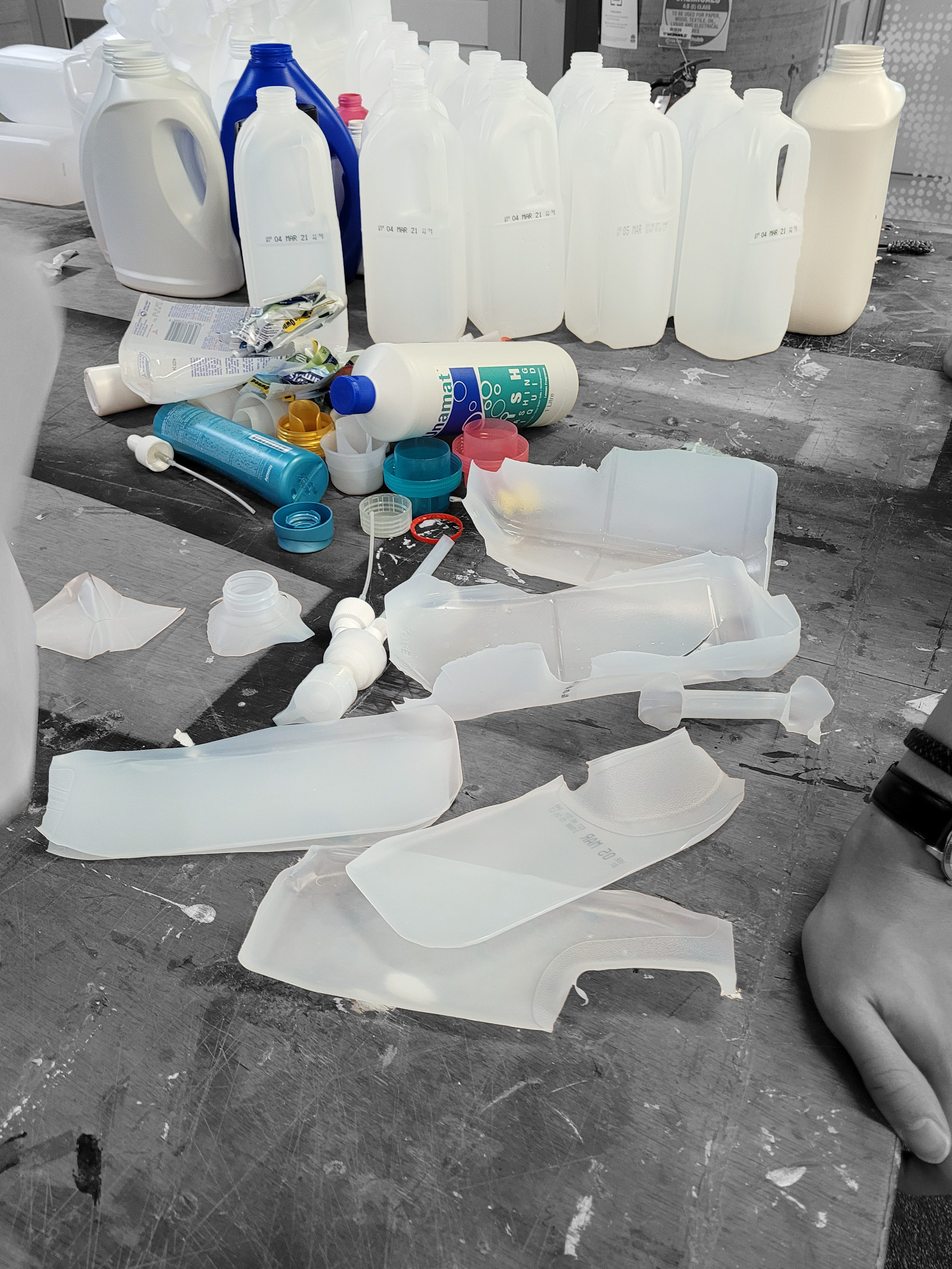 This project aims to upcycle plastic through the creation of flat, marbled and translucent sheets as the first step towards creating a stock material for the creation of higher valued items.